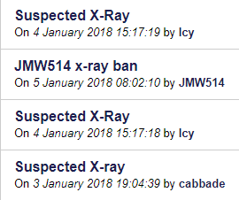 It has come to my attention that x-ray has become a bigger and bigger problem recently (image below shows a bit of this) and I don't really like the way it is being handled. I believe that people who x-ray, no matter who they are, should be punished more. People can get away with it easily if they are well known in the community, all it takes is a few "+1"s and some rebelling or protesting on the server and they could be well on their way to at most a 30 day ban. If people really need ores they shouldn't resort to hacking.Instead go ask for help from people, go mining with people, use tnt or set up a beacon. X-rayers should not be let off so lightly and in my opinion should have AT LEAST a 2 month ban. People find it very easy to seem apologetic but wont have changed. https://i.gyazo.com/14254477bdc8f5231b0d9cd9d0d15d68.png |