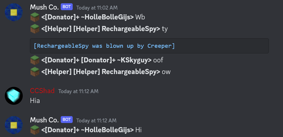 For the past week or two you may have noticed staff members testing out the new communication channel between the discord, and the minecraft server. We haven't encountered any serious problems with it, so we're expanding access to some of you guys in the community!