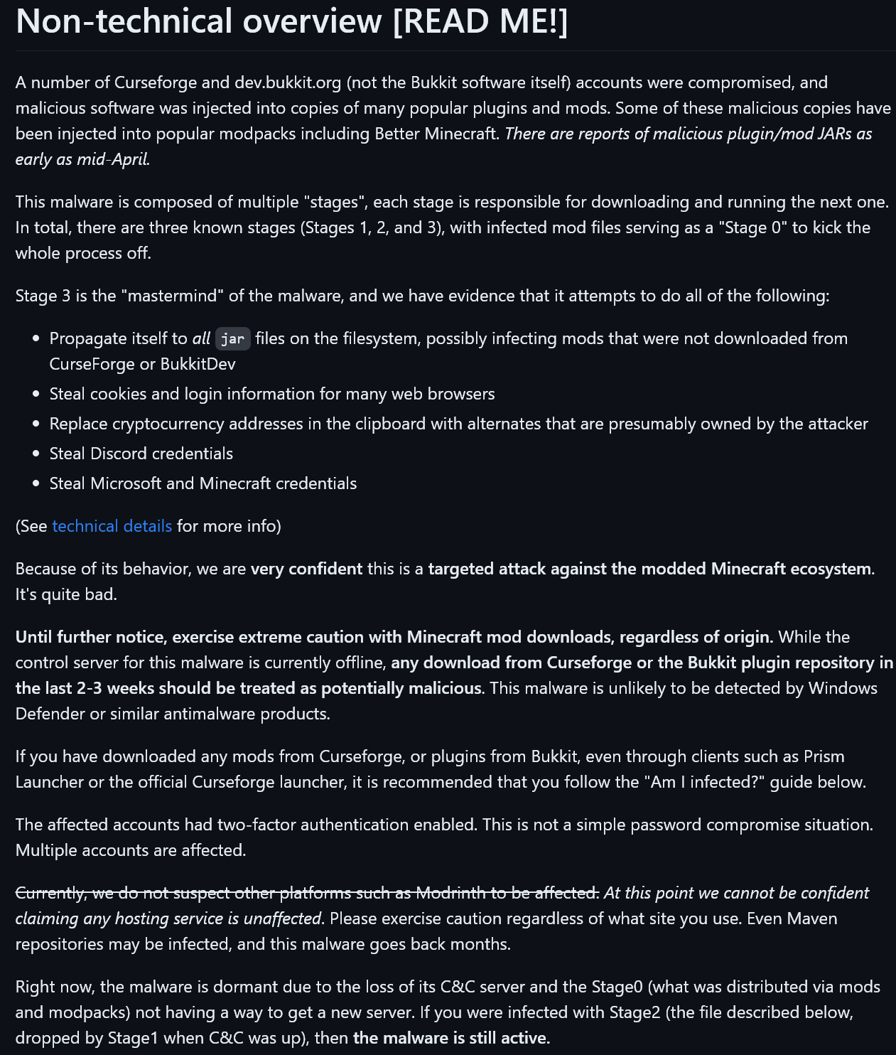 A planned attack was launched against the Minecraft modding community, which compromised CurseForge and Bukkit modder accounts, and injected many popular mods and modpacks. Once downloaded, these modified .jars ultimately try to infect every .jar on your system, all of which can then: